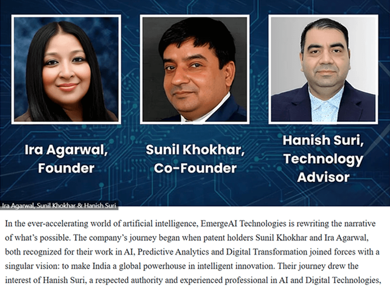 Ira Agarwal is a distinguished Wharton alumna and a globally recognized leader in AI innovation, digital transformation, board governance, and social entrepreneurship. She is the Founder & Board Chair of EmergeAI Technologies Pvt Ltd, a research-driven AI innovation organization; the Founder & CEO of AIM Elevate Ventures, a purpose-driven social enterprise; and the Founder of the Meet Ira leadership and mentorship platform. In board leadership, Ira serves as an Independent Director at ITCONS e-Solutions Ltd (BSE-listed) and as Board Chair at EmergeAI Technologies and AIM Elevate Ventures. She is also a Strategic Advisor to AAPNA Infotech, TeamTech EHS and Mallawa Ventures.