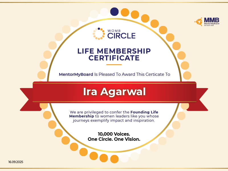 Ira Agarwal has been honored by Wharton Executive Education, The Wharton School for Social Innovation, Wharton Leadership Challenge Award & Wharton Alumnae Founder & Funders Association. She is a recipient of the Outstanding Leaders Award 2025 (UN Consultative bodies & Govt. of India), LinkedIn Top Voice (Technological Innovation), ET Leadership Excellence Award, Global Honor at the House of Commons (UK), Iconic Director Award by MentorMyBoard and WILL Forum & Ratan Tata National Icon Award.