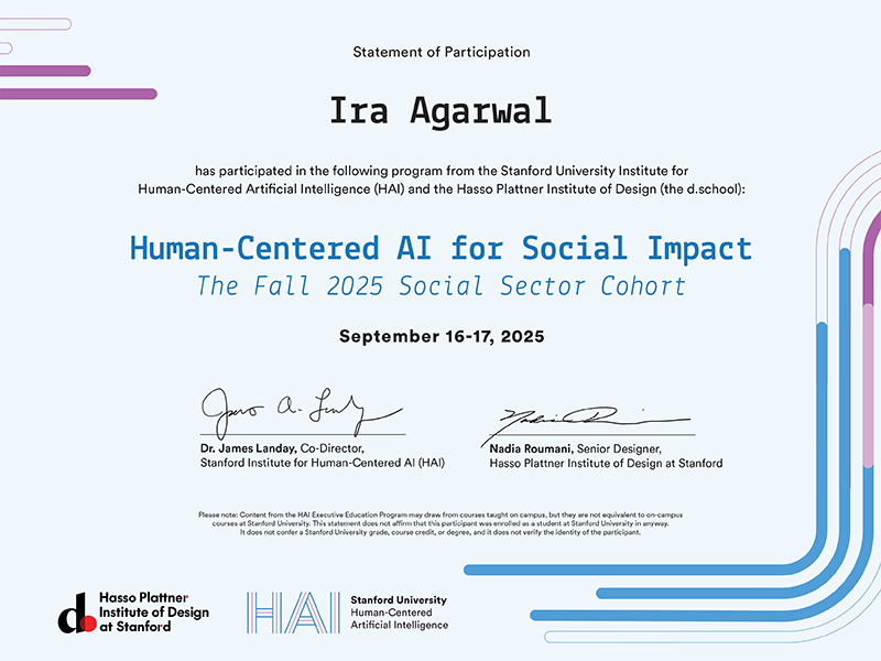 Earned distinction through the selection and successful completion of the prestigious Human-Centered AI for Social Impact & Innovation program, jointly offered by Stanford HAI and the Stanford D.school, reflecting commitment to driving ethical AI and transformative social impact.